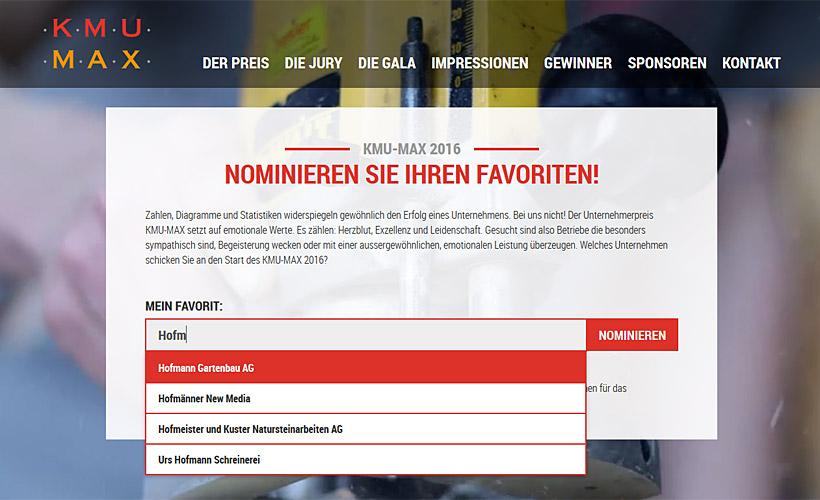 Achtung: wenn der Name Ihrer Firma nicht erscheint, sind evtl. nicht Mitglied beim KMU-Verband oder wurden noch nie nominiert. In diesem Falle müssen Sie sich zuerst einmal nominieren lassen. Nach der ersten Nomination wird ihre Firma gespeichert und erscheint im Auswahlmenü.